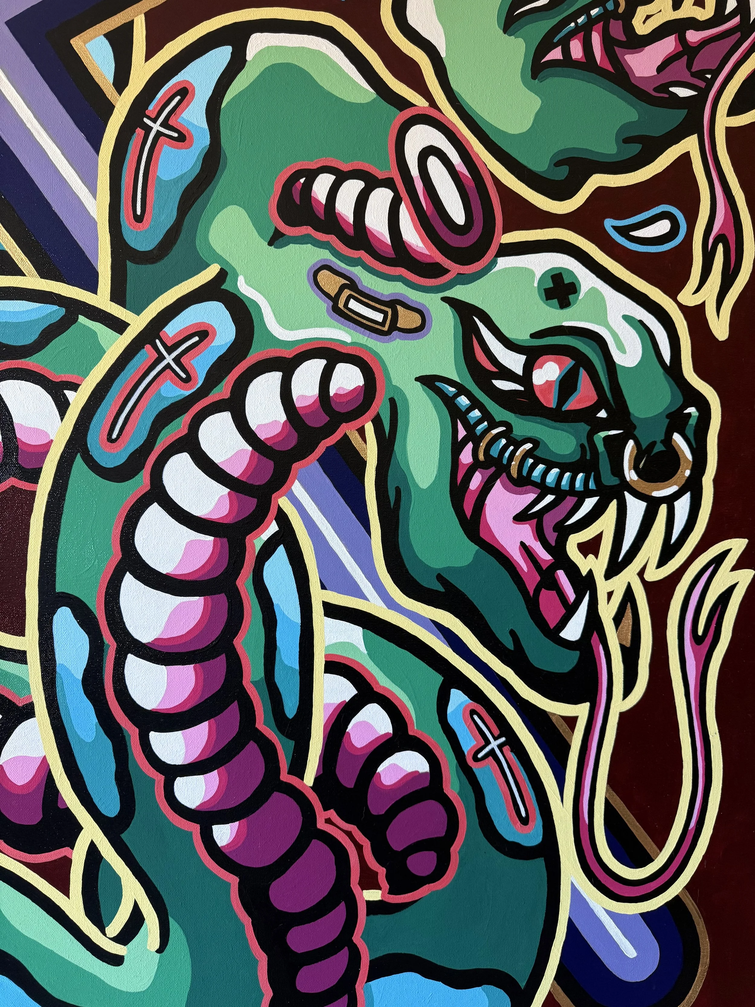 In this painting the blue cross going through the eyeball, red blood splatter in the top left corner and three barbell piercings on the eyeball stem are the details!
